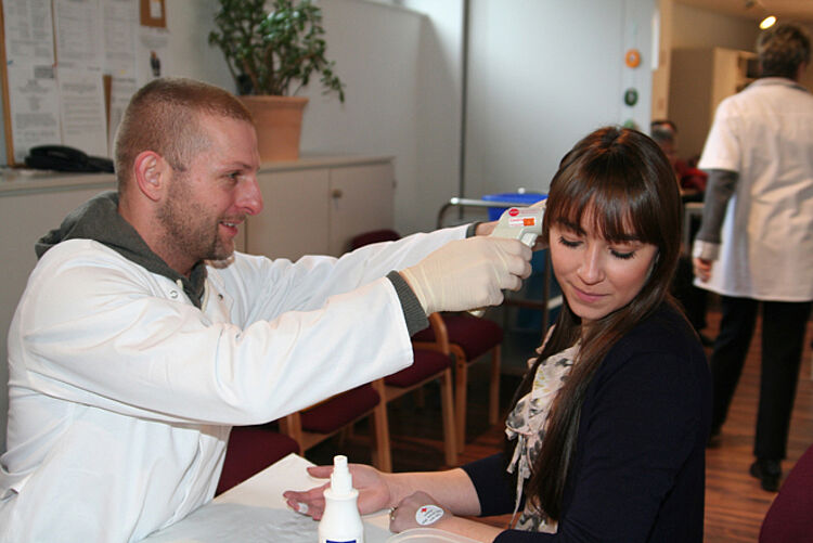 Danach werden die Körpertemperatur (im Ohr) und der Blutfarbstoffgehalt (Hämoglobinwert) festgestellt. Ein winziges Tröpfchen aus der Fingerkuppe oder dem Ohrläppchen reicht dafür aus. Blutdruck und Puls werden gemessen und alle Werte werden dokumentiert. Diese Daten geben zusammen mit dem ausgefüllten Anamnese-Fragebogen dem Arzt wertvolle Hinweise für seine Entscheidung über die Zulassung zur Blutspende.