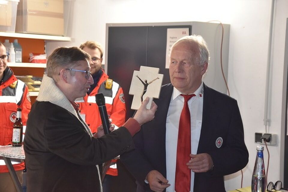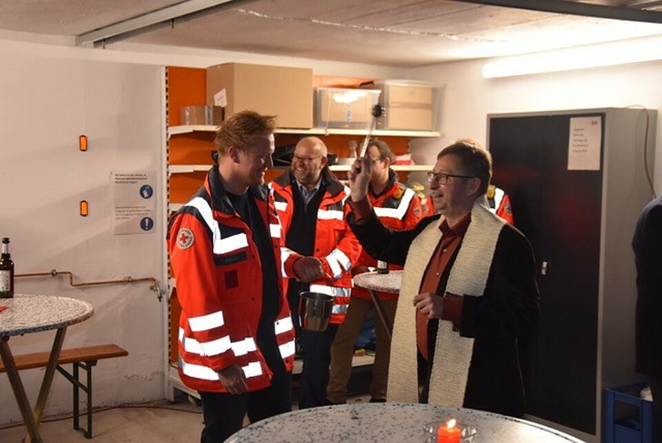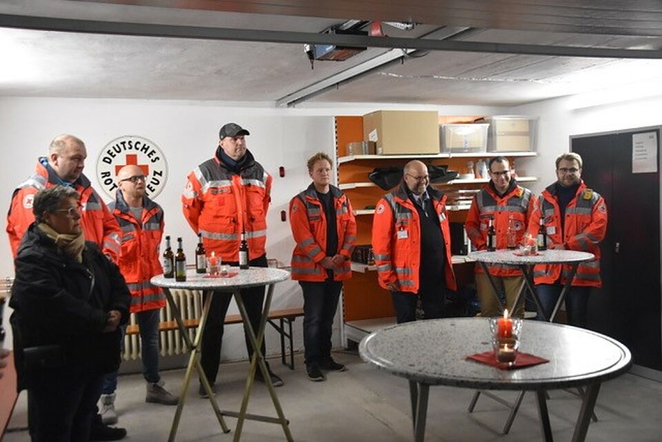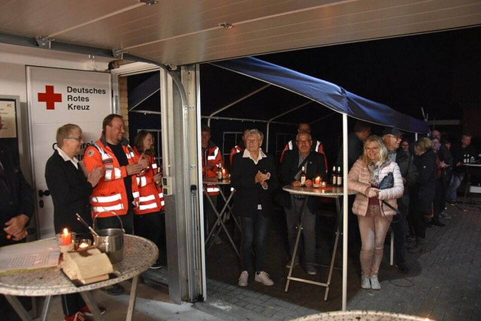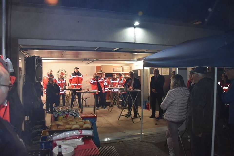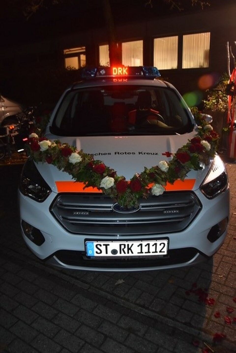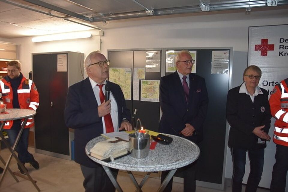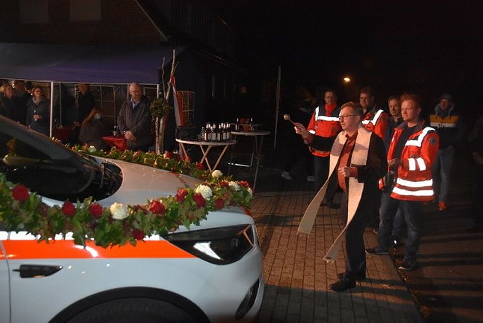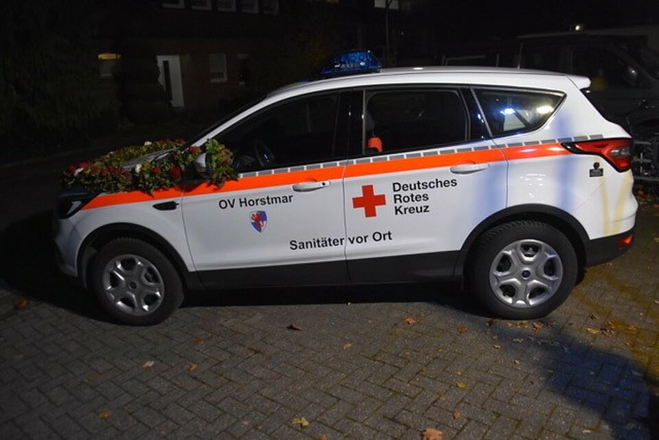 Der DRK Ortsverein Horstmar hat am 29. Oktober 2021 zur Einweihung der renovierten Garage an der Graf-Bernhard-Str. eingeladen. Gleichzeitig wurde auch der neue Medi-PKW offiziell in Dienst gestellt.Die Rotkreuzler hatten Vertreter der Politik und der Stadt- und Kreisverwaltung, der Kirche, des DRK-Kreisverbandes, der Feuerwehr und natürlich die Nachbarn eingeladen mit Ihnen die feierliche Übergabe der frisch renovierten Garage in einem kleinen Festakt zu begehen. Die Nachbarn hatten es sich nicht nehmen lassen, das neue Fahrzeug mit einem Kranz zu versehen und die Garage zu schmücken.Die Renovierung war notwendig geworden, da die Garagenformate aus den 70er Jahren für moderne Autos zu schmal sind. Gepaart mit einer Einsatzsituation, in der es auf schnelle Hilfe ankommt, führte es zu dem Schluss, dass aus zwei Garagen eine gemacht werden muss. Dank der Unterstützung der Stadt Horstmar, in deren Eigentum sich die Garage befindet, konnte ein breites Garagentor eingebaut werden, welches eine problemlose Ein- und Ausfahrt garantiert.Ein herzlicher Dank gilt an dieser Stelle den Mitarbeitenden der Verwaltung, dem Bürgermeister aber auch der Politik, die die Arbeit der Sanitäter vor Ort von Beginn an unterstützt haben.Die Position der Garage ist dabei von ganz besonderer Bedeutung, wie Björn Papendick als Sprecher der Sanitäter vor Ort schnell klar macht. Die zentrale Lage macht es in fast allen Fällen möglich, das eine/r der SanvO`s auf dem Weg zum Einsatz an der Garage vorbeikommt und das Fahrzeug mitnehmen kann. Björn konnte dann anhand einiger Zahlen und Fakten die bisherige Arbeit der Sanitäter vor Ort erläutern.Pfarrer Büll segnete die neue Garage und das Fahrzeug und stellte fest, dass seine kirchliche Aufgabe und die Aufgabe der freiwilligen Helfer des DRK viele Parallelen aufweisen. „Wir stehen für dieselbe Sache. Wir arbeiten für die Menschen. Unser Anliegen ist es, Menschen in Not zu helfen“.Ludger Hummert konnte als stellvertretender Bürgermeister die besten Wünsche der Stadt Horstmar, verbunden mit einem großen Dank an die Helfer überbringen.Helmut Heuing als Leiter des Amtes für Bevölkerungsschutz des Kreises Steinfurt stellte klar, dass die im Kreis Steinfurt mittlerweile in vielen Orten etablierten Ersthelfersysteme ein guter und richtiger Schritt sind, um das therapiefreie Intervall zwischen Notfall und Eintreffen des Rettungsdienstes zu überbrücken. Der Ortsverein Horstmar steht hierbei mit einer 98%igen Abdeckung aller Alarmierungen jedoch an der Spitze. Maik Fedeler, Geschäftsführer des DRK Kreisverbandes Steinfurt freute sich über die Etablierung dieses ehrenamtlichen Hilfsangebotes: „Nichts schlägt stärker als das Herz eines Freiwilligen“.Abschließend bedankte sich Frank Burrichter für die gute Zusammenarbeit zwischen Feuerwehr und DRK.Bei Bratwurst, Kaltgetränken und vielen guten Gesprächen konnte der Abend dann ohne einen Einsatz fortgeführt werden.Der DRK Ortsverein Horstmar möchte sich an dieser Stelle nochmals bei allen Spendern, Gönnern, Nachbarn, Mitwirkenden und Wohlgesonnenen für die Unterstützung der Arbeit der SanvO`s bedanken.
