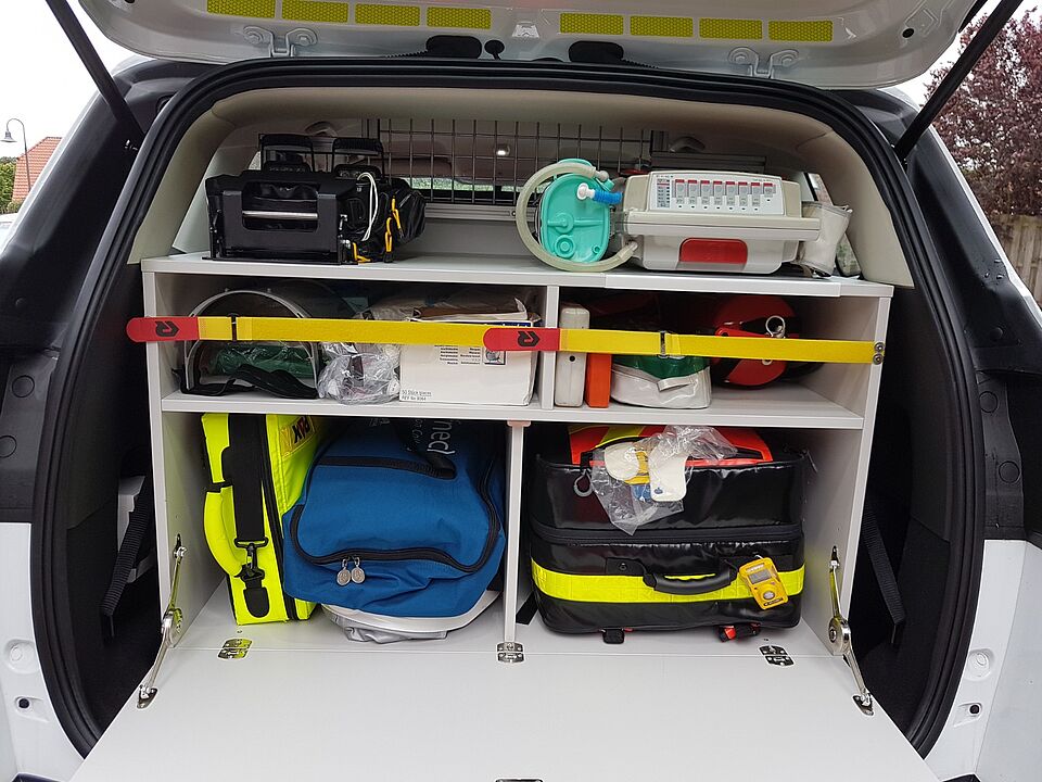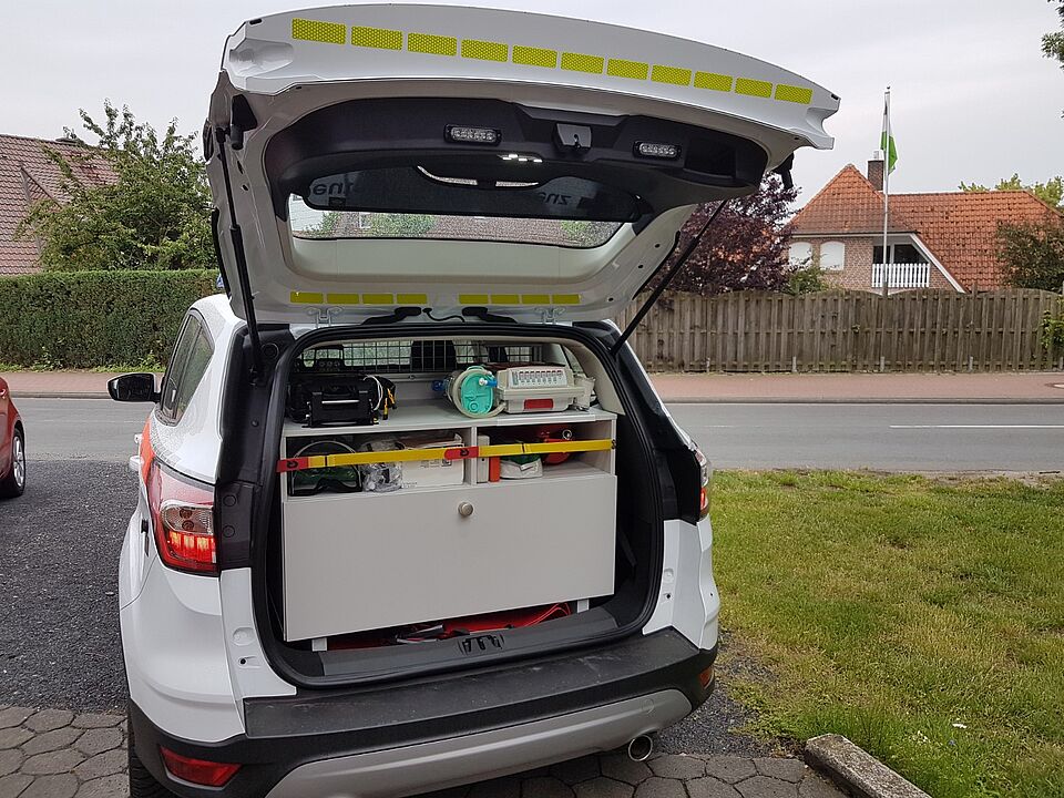 Das Fahrzeug ist ein junger Gebrauchtwagen, der von der Fa. Rotte in Nordkirchen nach unseren Vorstellungen und Wünschen um- und ausgebaut wurde. Es wurde eine Sondersignalanlage, eine externe Ladeerhaltung sowie eine Funkvorbereitung eingebaut. Im Kofferraum wurde ein Regal eingepasst, in welchem das gesamte Material untergebracht werden kann. Weiterhin wurde das Fahrzeug foliert und beschriftet.